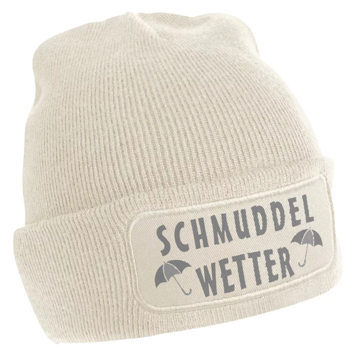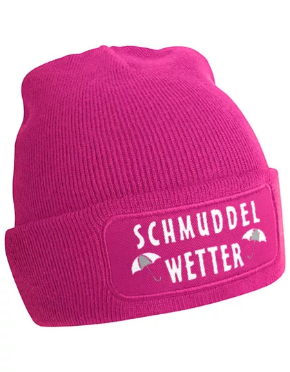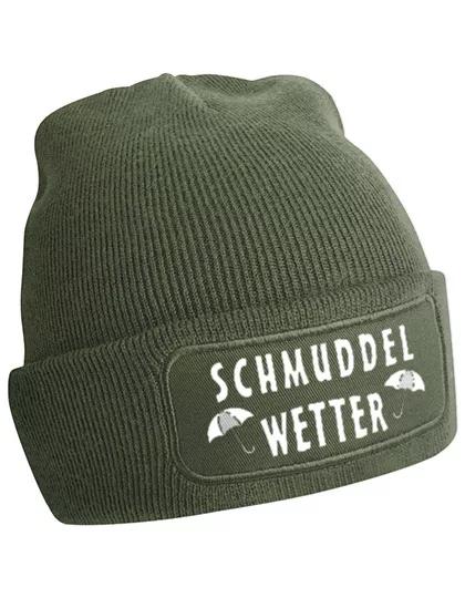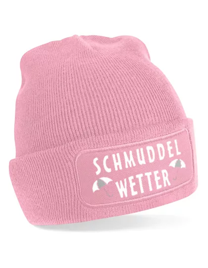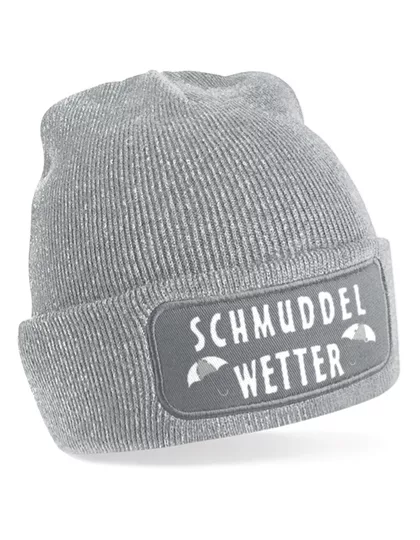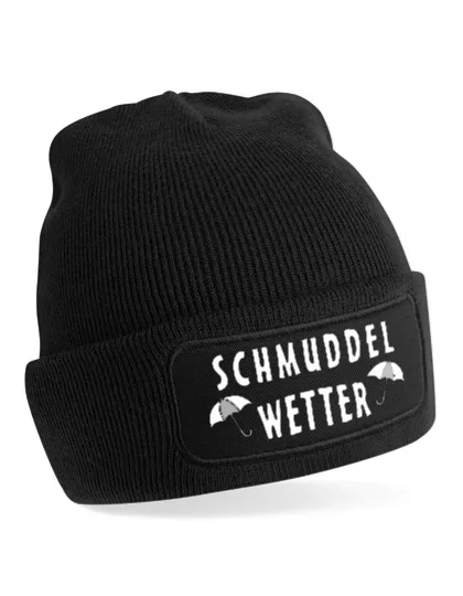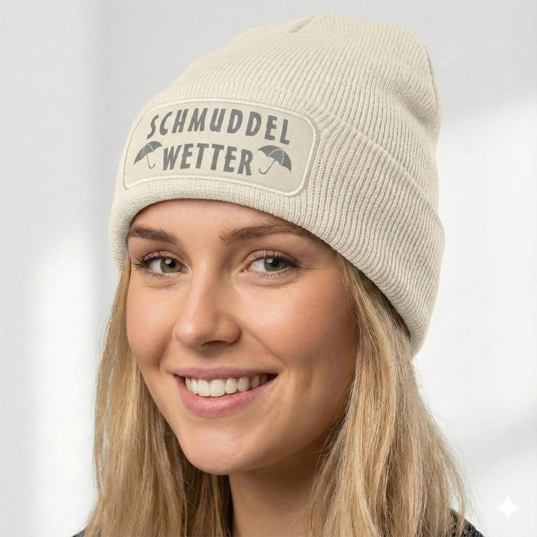 Stilvoll durch Wind und Wetter! Mit unserer hochwertigen Beanie Mütze zeigst du dem grauen Alltag die kalte Schulter. Das exklusive Design mit dem „Schmuddelwetter“-Schriftzug und den charmanten Regenschirm-Icons macht diese Mütze zum absoluten Lieblingsstück für Herbst und Winter.“