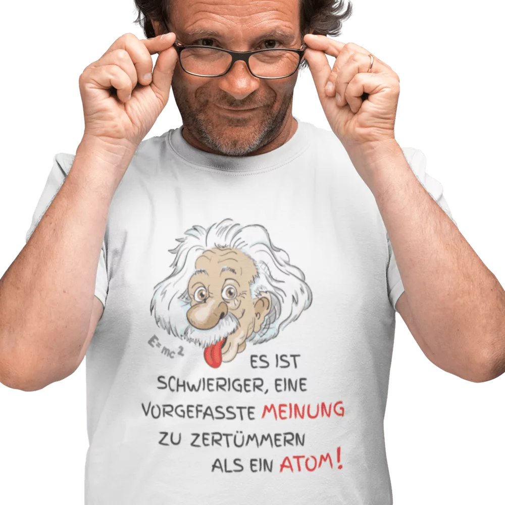 Einstein-T-Shirt mit scharfsinnigem Zitat: “Es ist schwieriger, eine vorgefasste Meinung zu zertrümmern, als ein Atom!” Perfekt für Denker und Kritiker.