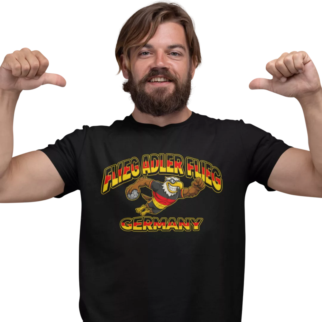 Fan T-Shirt mit dem Statement „FLIEG ADLER FLIEG“ als Brustmotiv. Erhältlich in Weiß und Schwarz – bequem zu tragen, stark im Look, ideal für Stadion, Freizeit und Public Viewing.