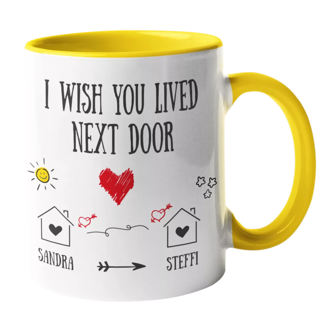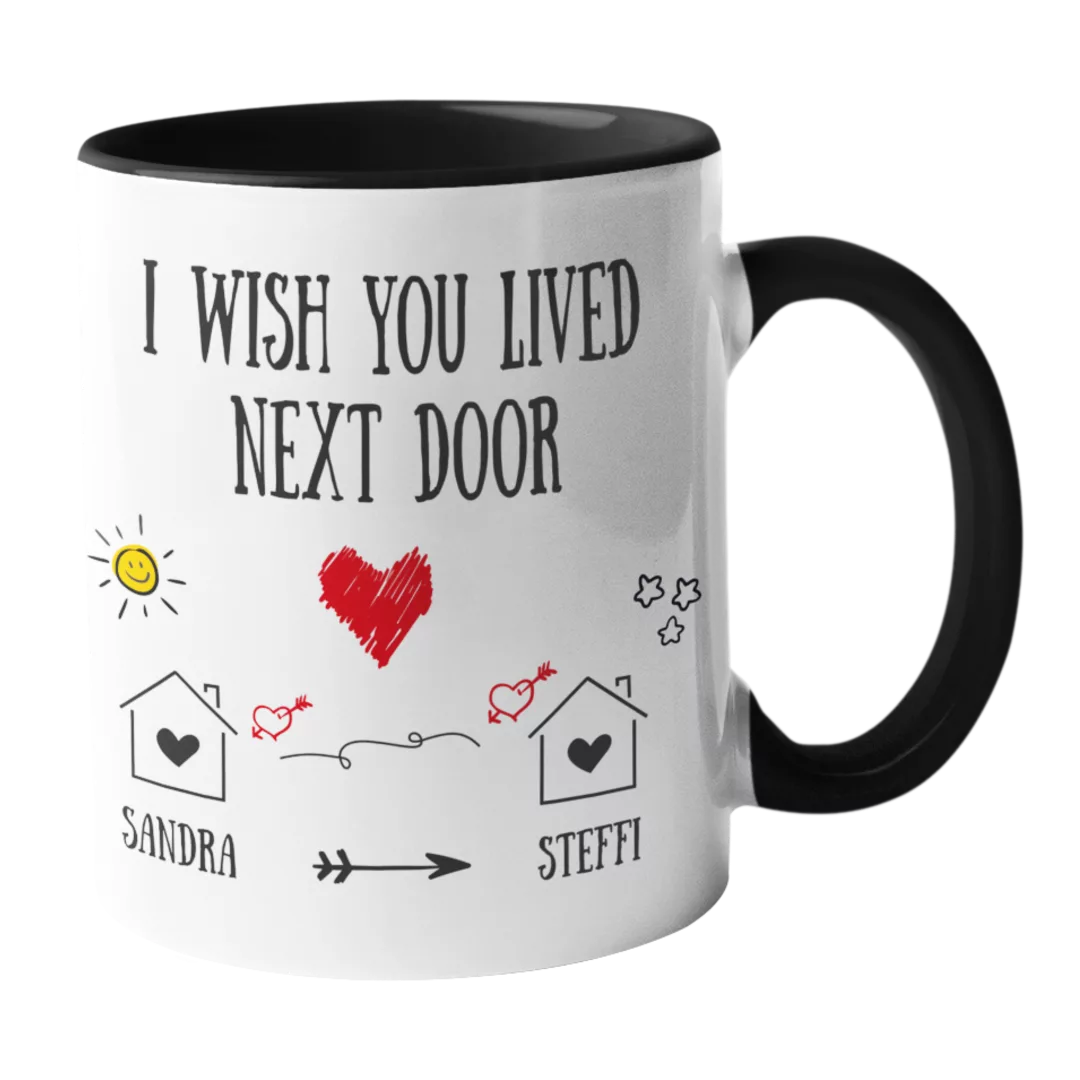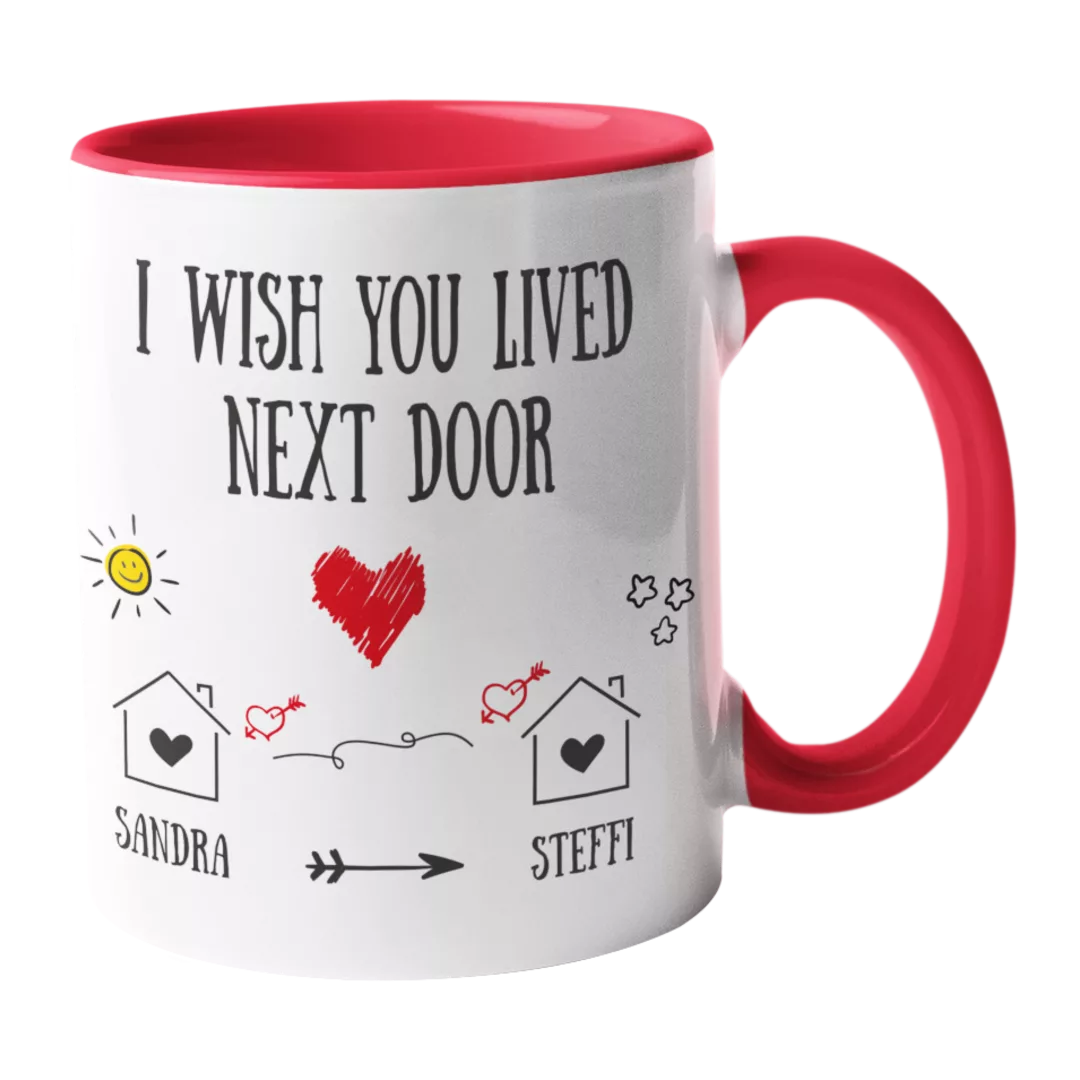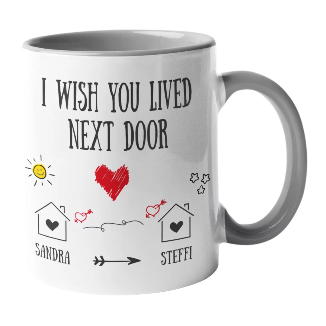 Diese Tasse spricht für sich! Mit dem herzerwärmenden Spruch “I wish you lived next door” drückst du auf liebevolle Weise aus, was du fühlst. Perfekt für alle, die eine besondere Verbindung zu jemandem haben. Sichere dir jetzt diese Tasse und bereite eine Freude, die jeden Morgen aufs Neue berührt.
