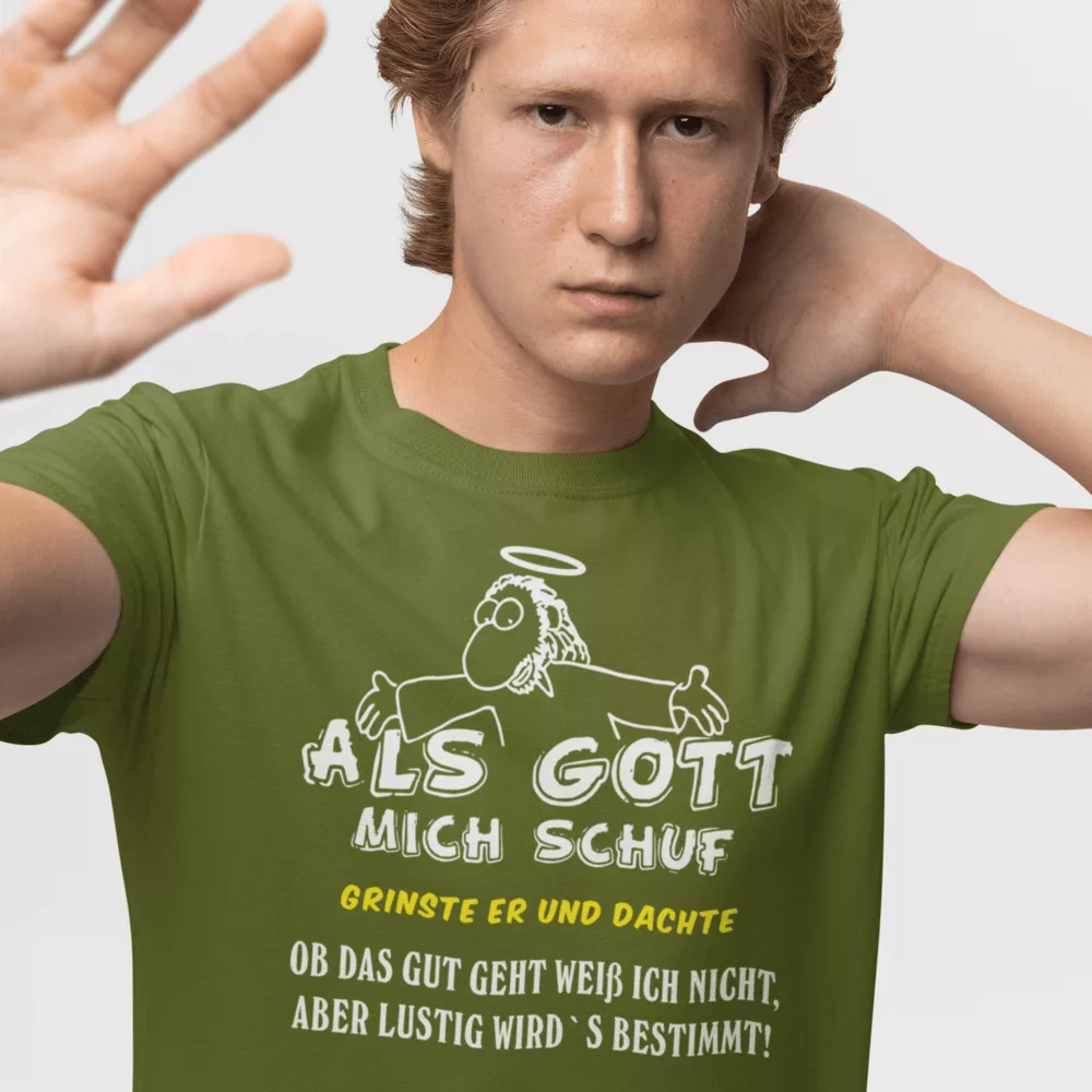 Hol dir das witzige T-Shirt: „Als Gott mich schuf, grinste er und dachte, ob das gut geht, weiß ich nicht, aber lustig wird’s bestimmt.“