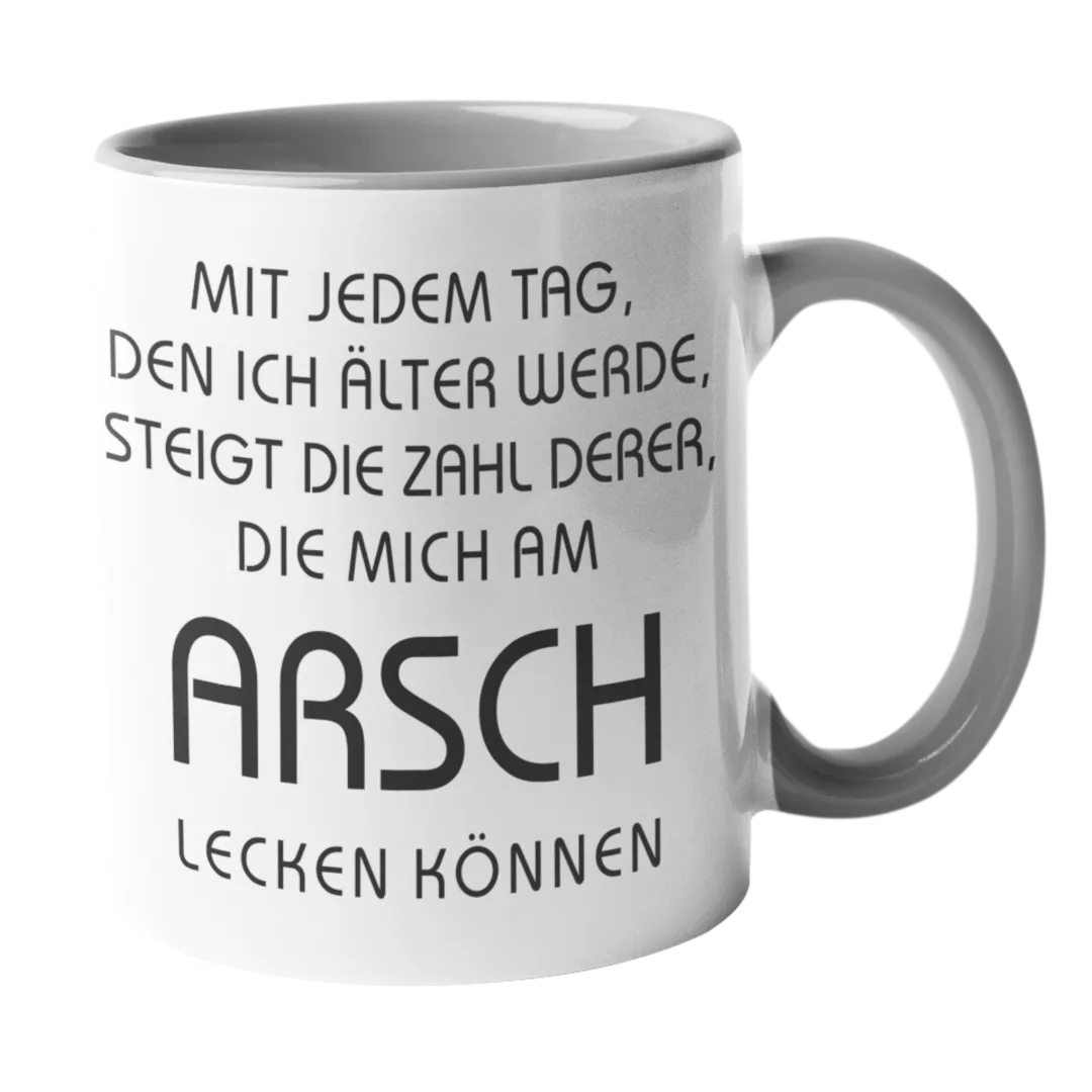 Zeige allen, dass du älter und weiser wirst – mit dieser lustigen Tasse! Der freche Spruch “Die Zahl derer, die mich am Arsch lecken können, wächst mit jedem Tag, den ich älter werde” ist perfekt für alle, die ihren Humor lieben und keine Angst haben, ihre Meinung zu sagen.