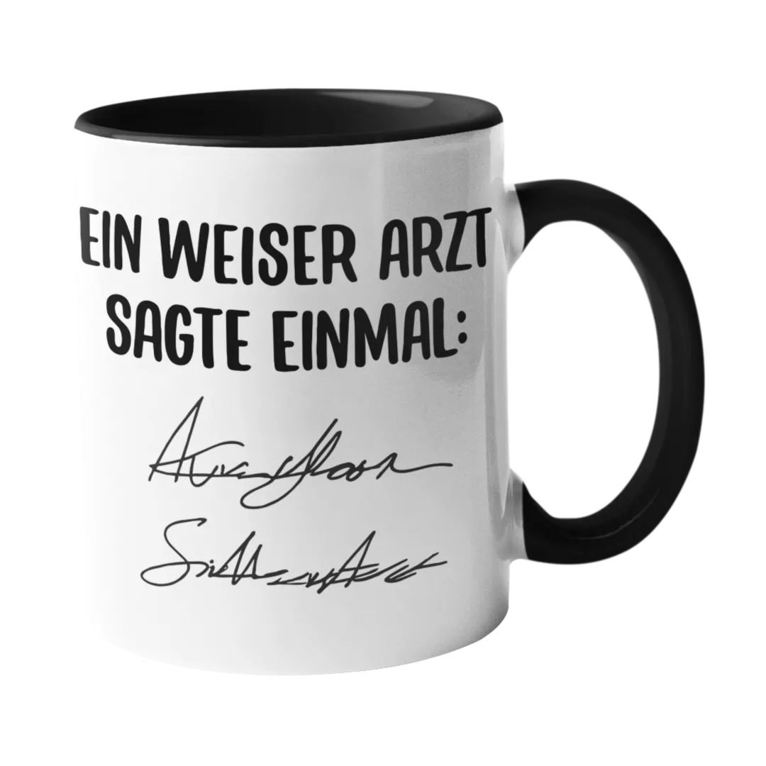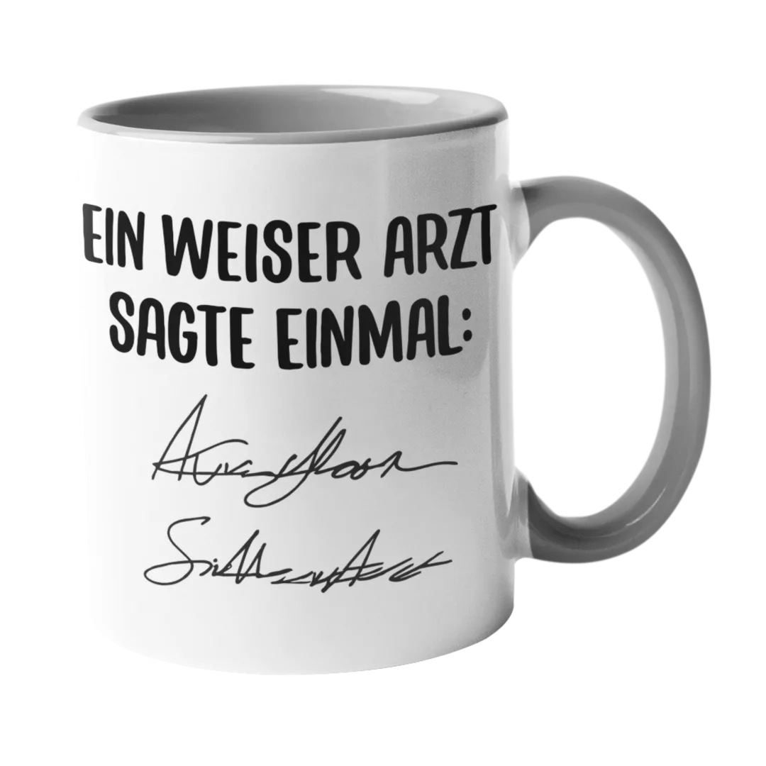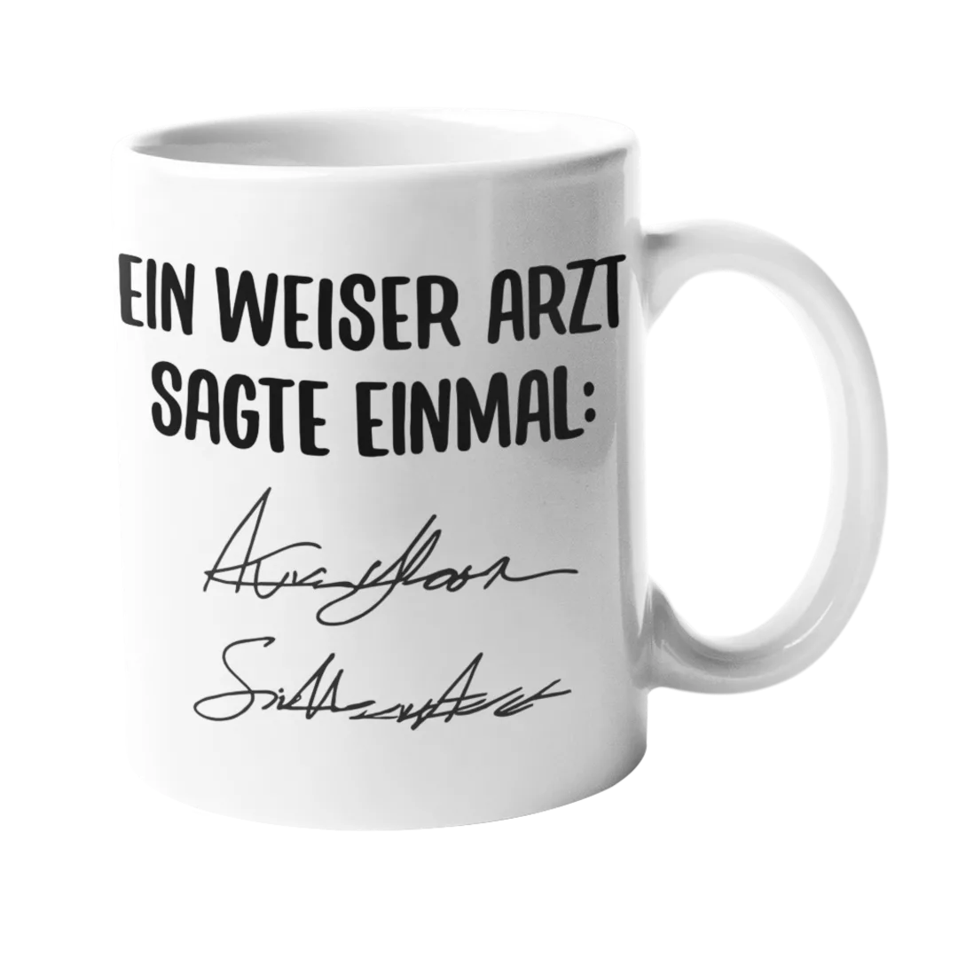 Bedruckte Tasse „Ein weiser Arzt sagte einmal“ – ein kleiner Humor-Kick für Praxis, Klinik und Büro.