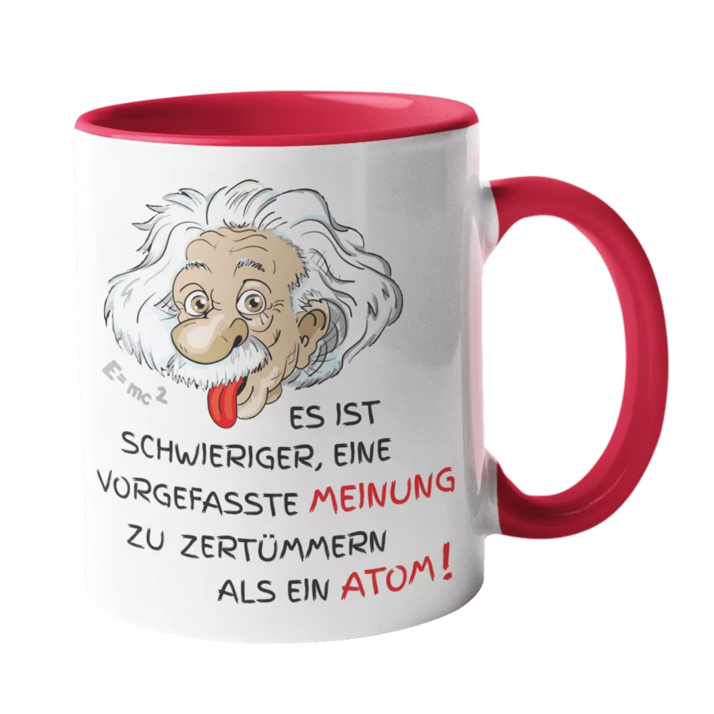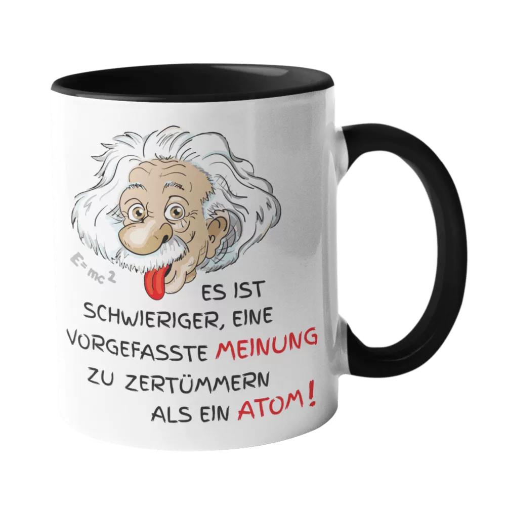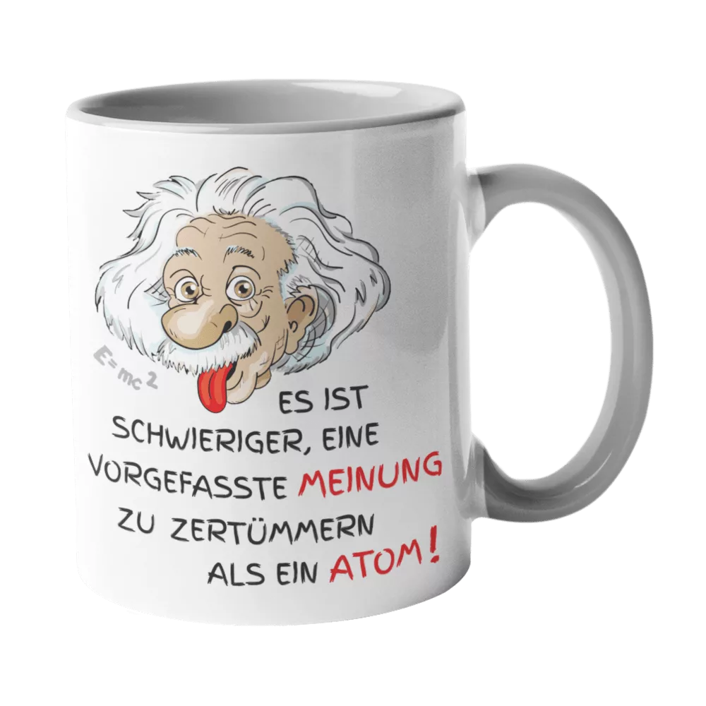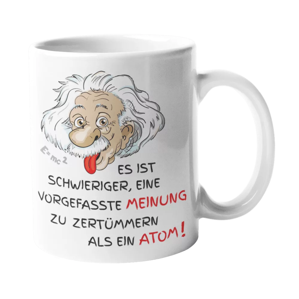Einstein-Tasse mit kultigem Zitat: “Es ist schwieriger, eine vorgefasste Meinung zu zertrümmern, als ein Atom.”