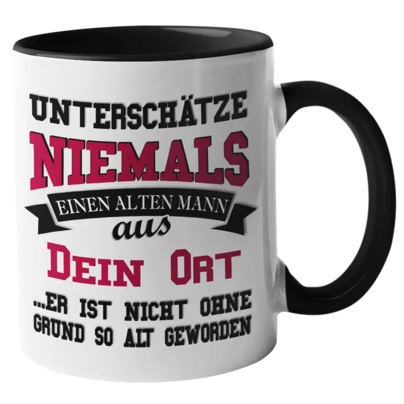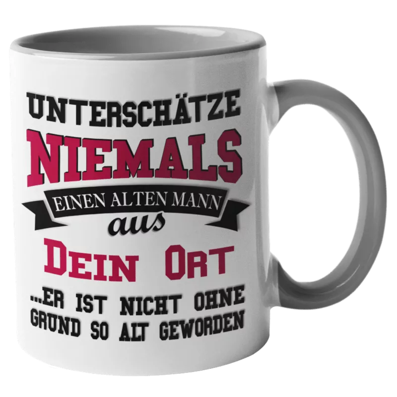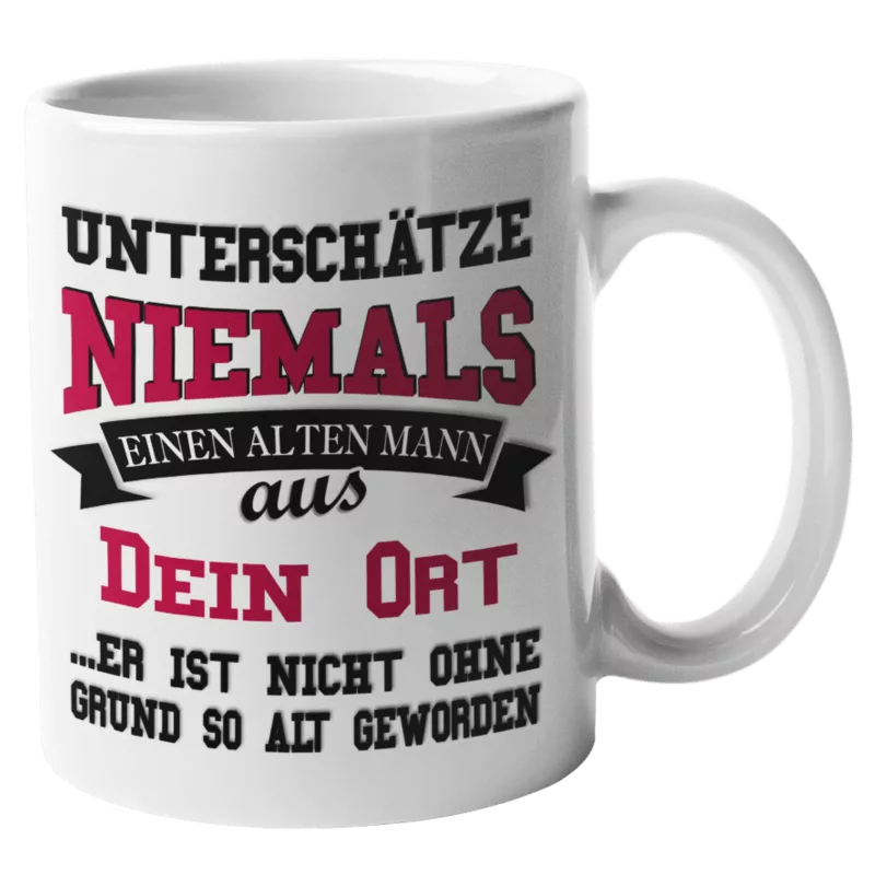 Humorvolle Tasse „Unterschätze niemals einen alten Mann“ – das perfekte Geschenk für Vater, Opa, Kollegen oder alle, die Humor und Lebenserfahrung schätzen.