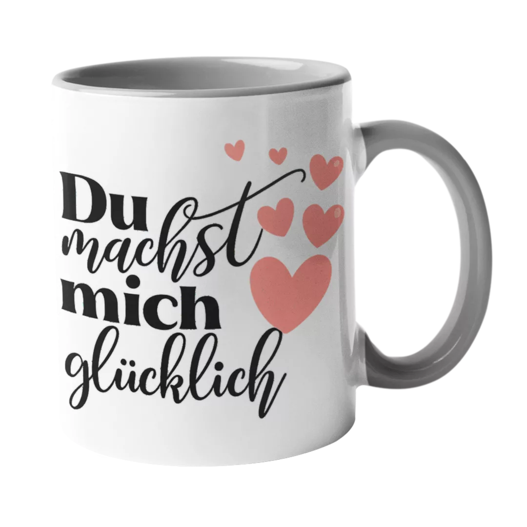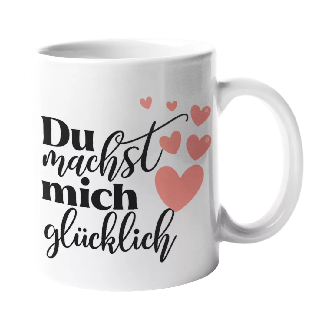 Der Spruch „Du machst mich glücklich“ macht diese Tasse besonders. Sie eignet sich zum Valentinstag, zum Jahrestag oder einfach zwischendurch. Außerdem ist sie persönlicher als Blumen und haltbarer als Schokolade. Vor allem wird sie jeden Tag genutzt.
